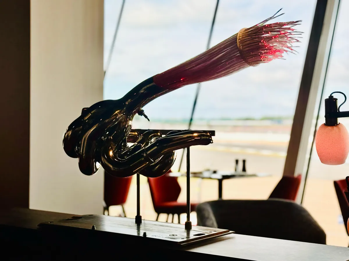 The horizontal mounted sculpture displayed here uses the race run exhaust from Fernando Alonso’s championship race winning R26 Renault F1 car of 2006.